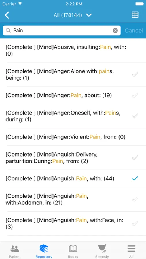 Easy search options let you browse through thousands of rubrics across latest and most authentic Homeopathy repertories such as Boericke, Kent, Boger, Phatak and latest Complete Repertory 2016. Record the precise rubrics with just one touch and get the best Homeopathic remedy in the shortest time.