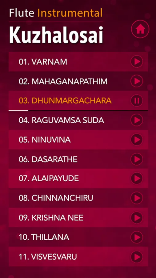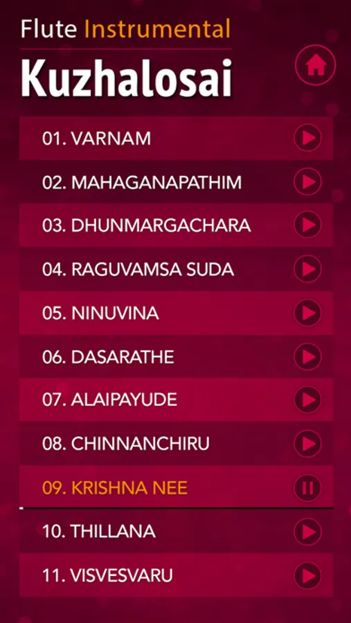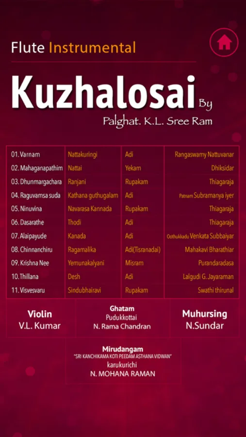 Listen to one of the most enchanted music on Kuzhalosai by Palghat K.L.Sree Ram. This App has a collection of Famous composers like Lalgudi G.Jayaraman,Purandaradasa,Oothukkadu Venkata Subbaiyar,Patnam Subramani Iyer, Rangasamy Nattuvanar.