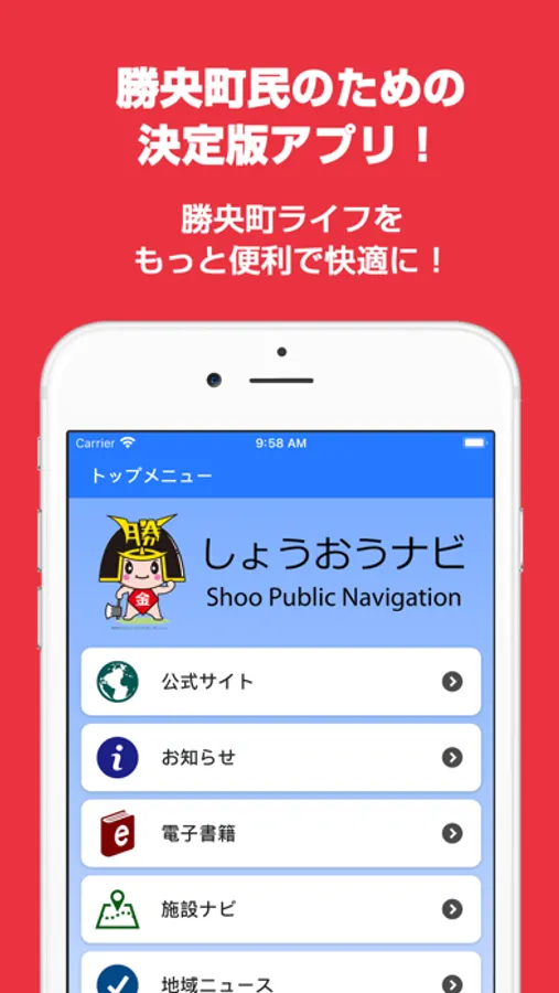 しょうおうナビは、勝央町民のための生活情報アプリです。「暮らしに便利な情報を通知でお知らせ」「地域ニュースや最新の行政情報」「公共施設等へのナビ」など情報満載!