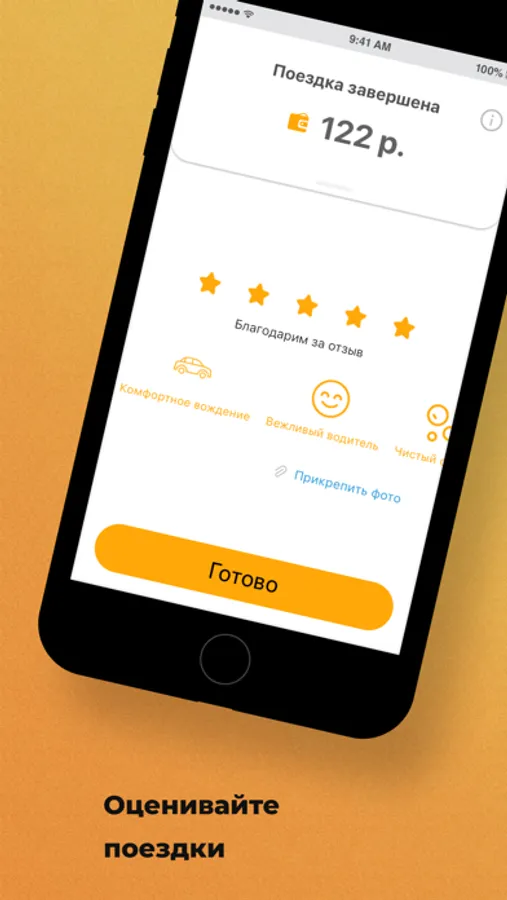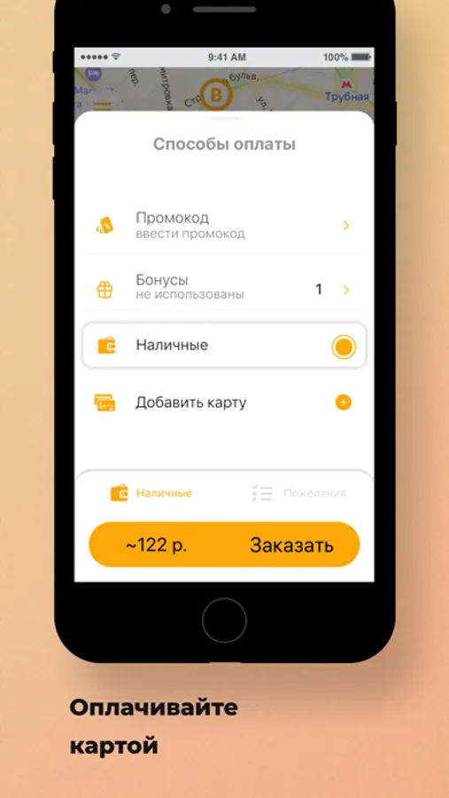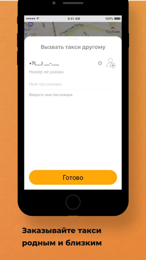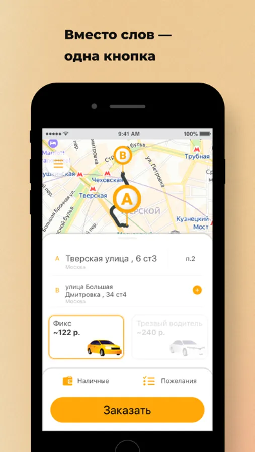 Следите за поездкой на карте. Приложение сообщит время подачи, марку, цвет, номер машины, а также имя водителя.