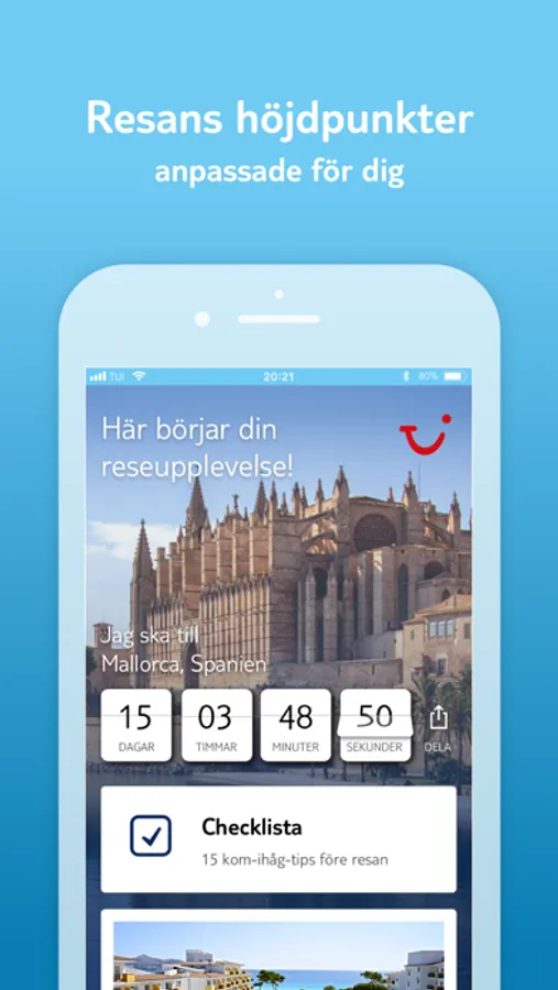 TUIs reseapp gör semesterlivet enklare och tryggare. Du har all information om din resa samlad på ett ställe – i TUI-appen i din mobil. Den ger dig direktkontakt med TUI-guiderna dygnet runt, såväl före som under resan. I appen kan du även se dina flyg- och transfertider, få tips på saker att se och göra på resmålet och välja mellan mängder av utflykter, aktiviteter, flyg och hotell, som du kan boka direkt via reseappen.