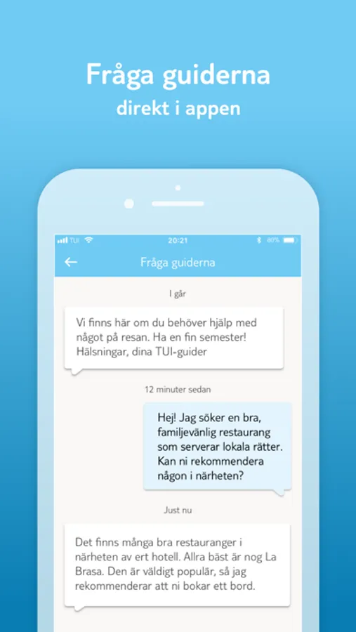 Via TUI-appen kan du under resan få kontakt med guiderna dygnet runt, alla dagar. Du skickar ett meddelande via Fråga guiderna i appen och får svar inom en kort stund. Och du når guiderna via appen även i planeringsfasen – redan från dagen efter att du bokat resan. I appen får du också servicemeddelanden och annan viktig information under resan.