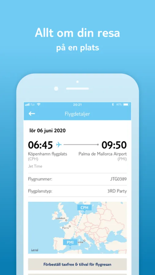 I vår reseapp kan du beställa taxfree och uppgradera din flygresa – välja sittplats, boka extra benutrymme och extra bagagevikt. (Gäller vissa flyg).