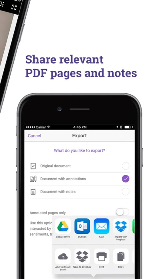Choose from a superior set of features to customize exports - export only the document, the document with your notes, the document with a certain type of notes, just certain pages, etc.