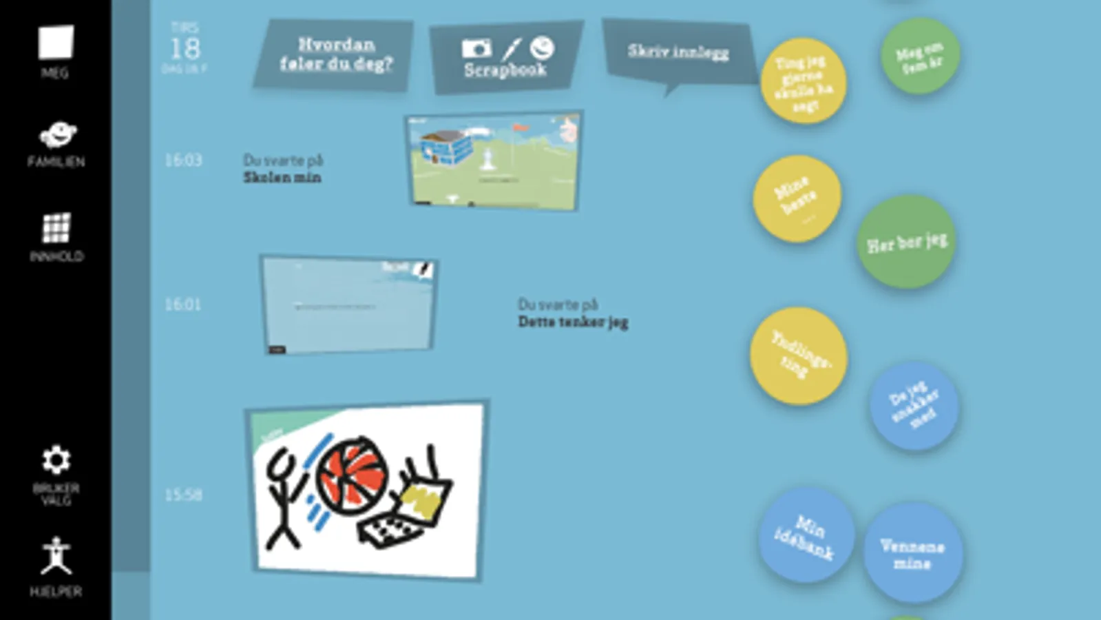 Dagbokfunksjonen i appen åpner for å skrive, tegne eller legge inn bilder. Innholdet lagres lokalt og er passordbeskyttet. Man kan kronologisk scrolle gjennom tidligere innlegg som er datosortert. Les om opplevelser og tanker fra andre unge som har vært i liknende situasjon. Appen inneholder også idébank, humørgenerator og skjønnlitterære noveller tilpasset målgruppen.