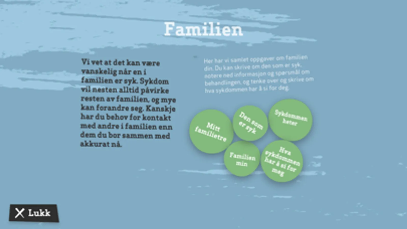 Appen «Meg også» er beregnet på barn og unge som opplever sykdom i nær familie eller vennekrets. Den har til hensikt å være en hjelp for unge til å bearbeide den vanskelige situasjonen det kan være, å være ung og pårørende. Appen er utviklet i tett dialog med barn og ungdom som selv har vært pårørende.