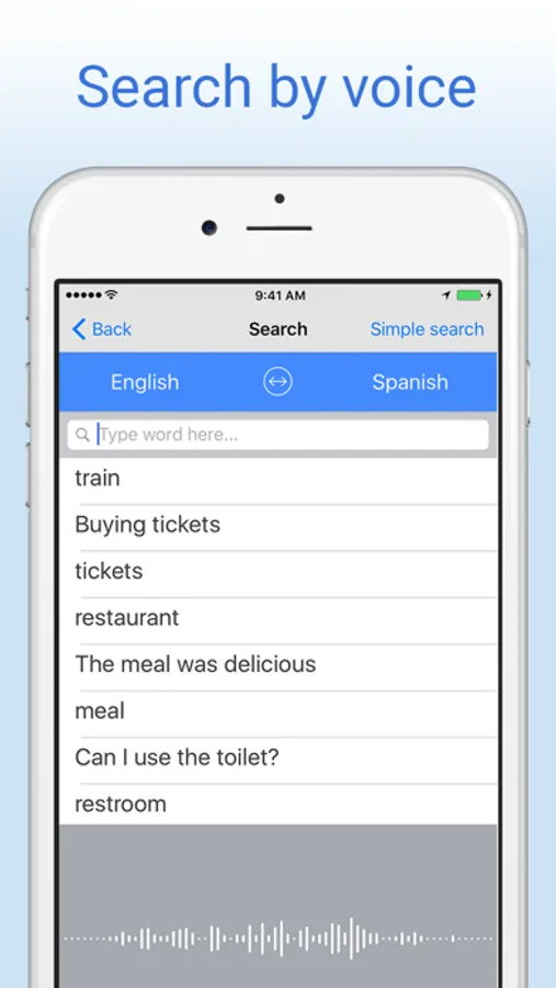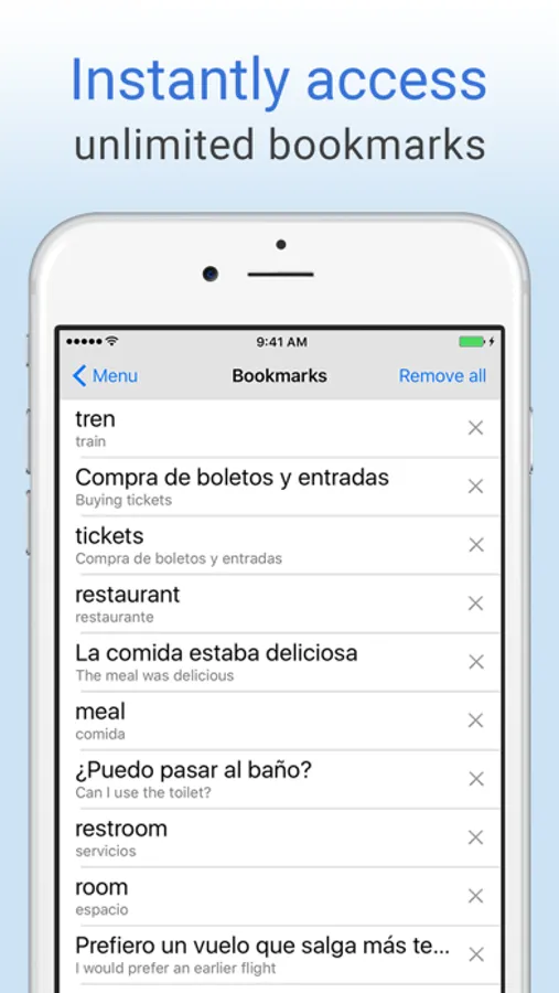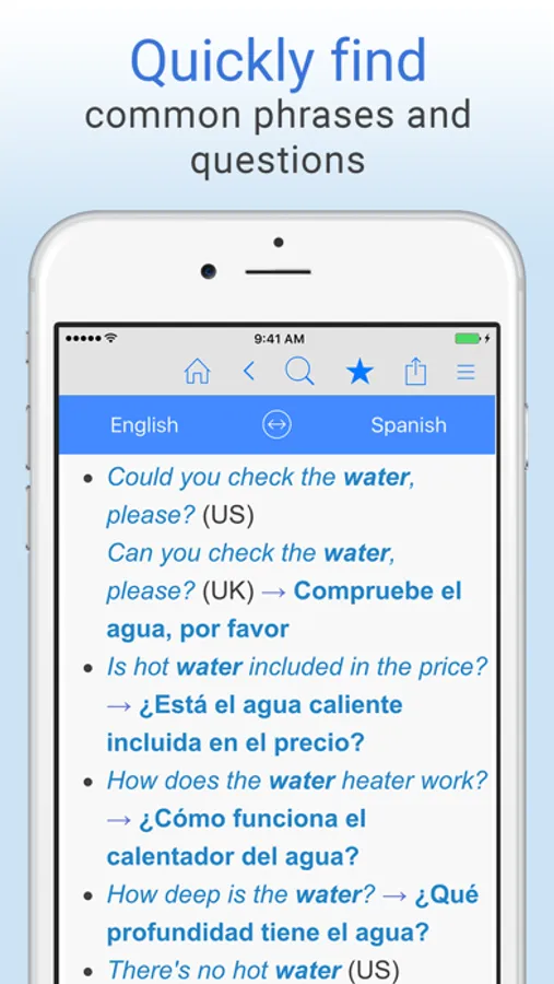 Free English-Spanish translation dictionary and phrase translator. Translate words from English to Spanish or Spanish to English, even offline! Search by voice, play audio pronunciations of words, save unlimited bookmarks, and more. The perfect app for learning Spanish or traveling to Spanish-speaking countries!