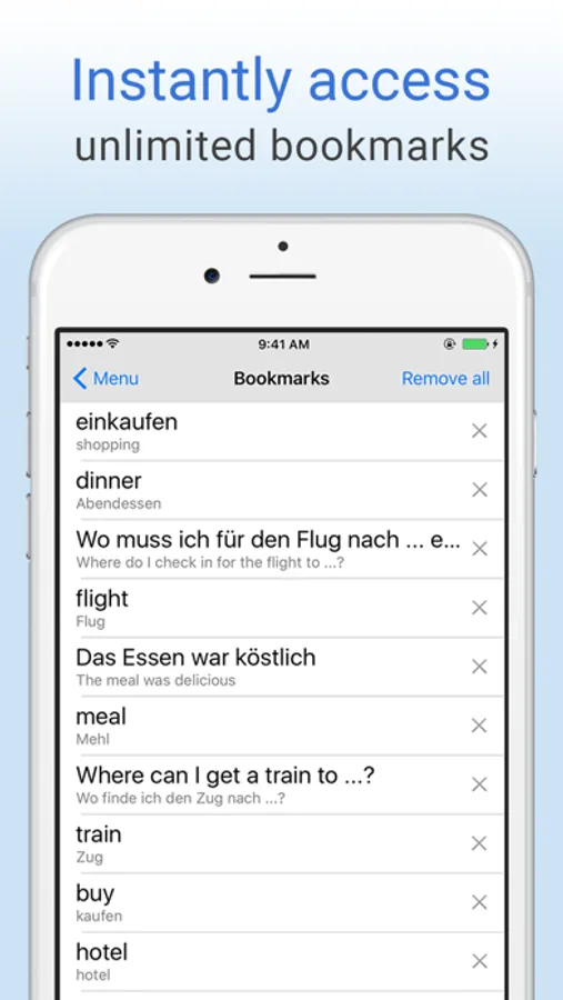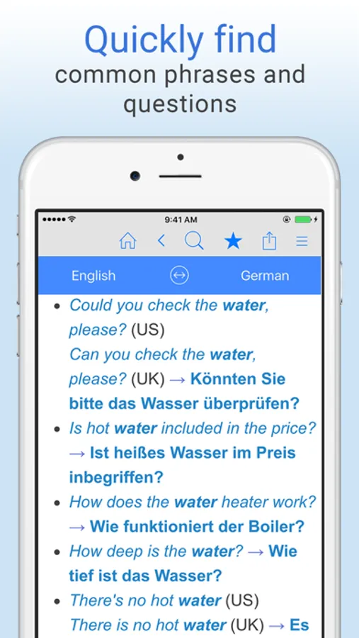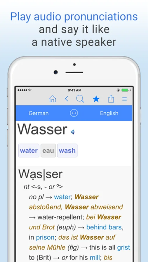 Free English-German translation dictionary and phrase translator. Translate words from English to German or German to English, even offline! Search by voice, play audio pronunciations of words, save unlimited bookmarks, and more. The perfect app for learning German or traveling to German-speaking countries!