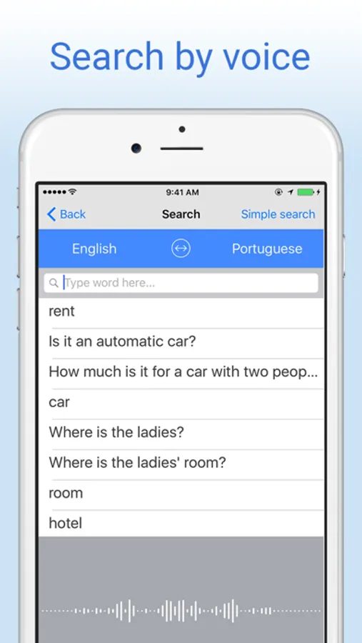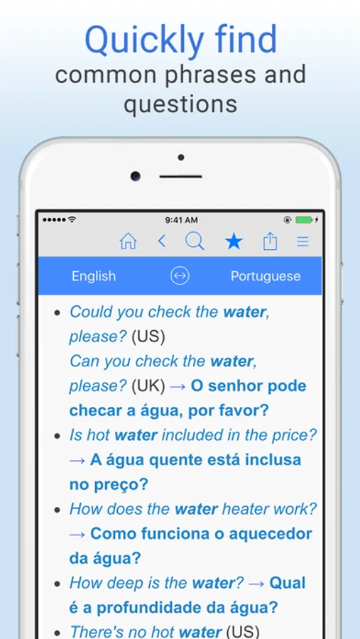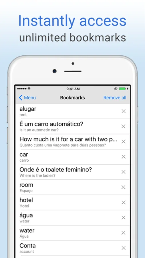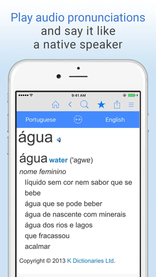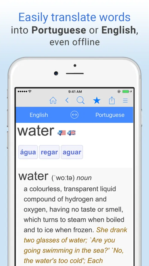 Free English-Portuguese translation dictionary and phrase translator. Translate words from English to Portuguese or Portuguese to English, even offline! Search by voice, play audio pronunciations of words, save unlimited bookmarks, and more. The perfect app for learning Portuguese or traveling to Portuguese-speaking countries!
