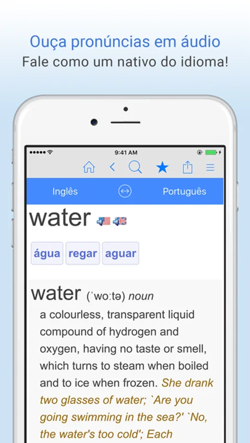 Traduza palavras e frases comuns do português para o inglês OU do inglês para o português! O Dicionário de Traduções Português-Inglês da Farlex mostra traduções instantâneas com busca de voz ou texto, além de pronúncias em áudio, definições, sentenças de exemplos e muito mais!