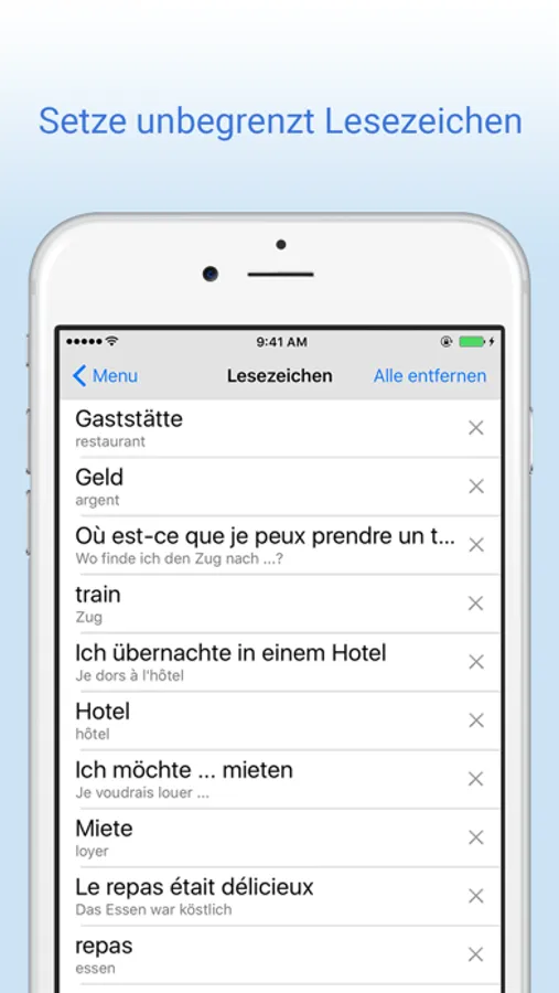 * Setze unbegrenzt Lesezeichen und greife schnell auf alle gespeicherten Wörter zu.