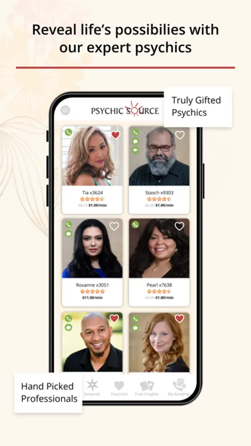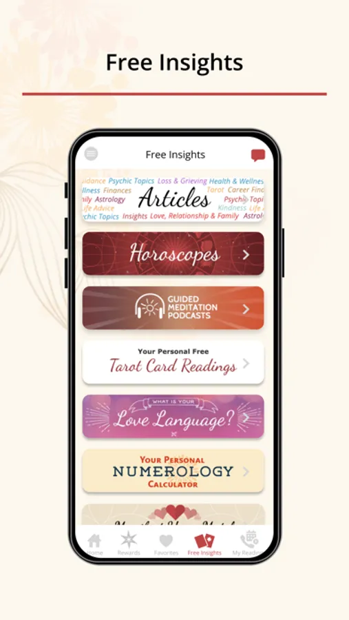 All app users can also get Free Insights including tarot card readings and daily and yearly Horoscopes. Listen to our meditation podcasts starting with our Attracting Love series. Free access to all Psychic Source content including articles by your favorite advisors, infographics, podcasts, videos and more. Easily share all content from the app with friends.
