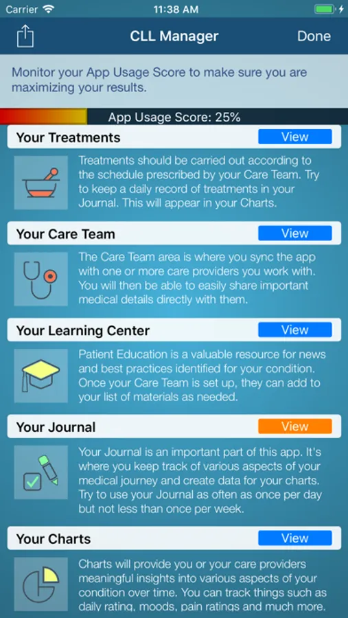 When you are living with CLL, the CLL Manager can help you manage the symptoms that affect you every day. Studies show that people with chronic diseases can positively affect their lives by using @Point of Care apps to track pain, medications, and more—giving a sense of control over their conditions.