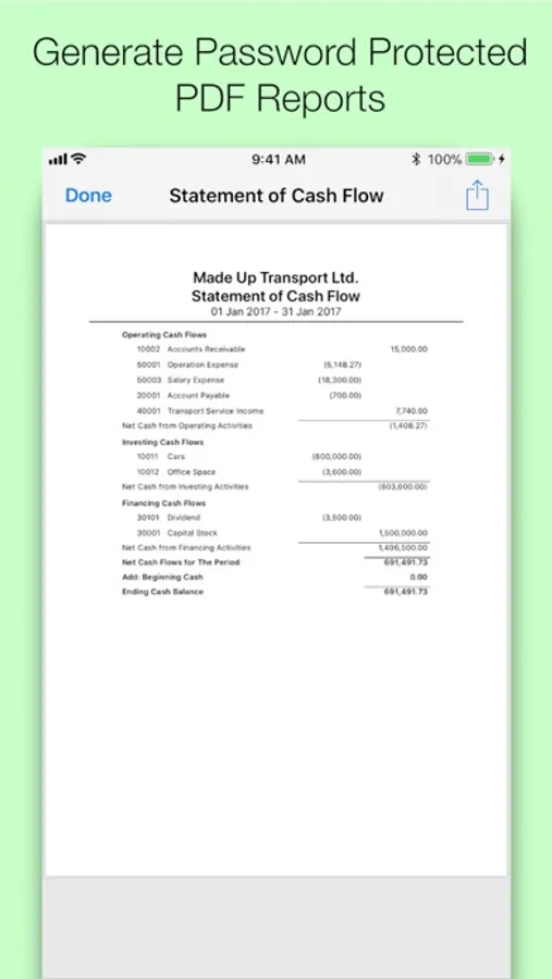 • Generate password protected PDF reports (Journals, Account Ledger, Trial Balance, Income Statement, Statement of Retained Earnings, Balance Sheet, Statement of Cash Flow)
