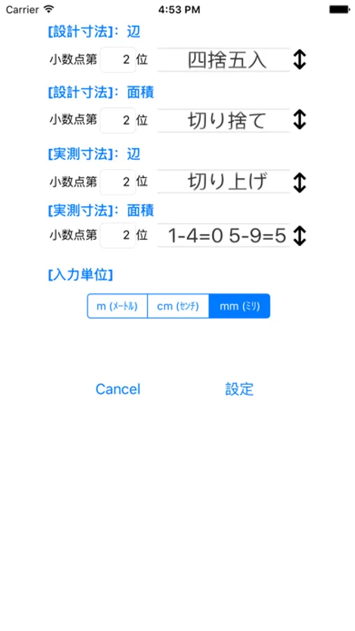 ※設計値・実測値の「切上げ、切下げ、四捨五入、端数1-4=0, 5-9=5、なにもしない」の選択が可能です