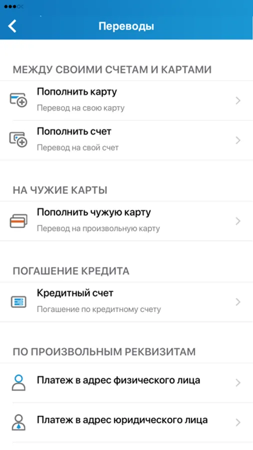В настоящее время реализация позволяет выполнять операции по своим банковским картам и счетам: