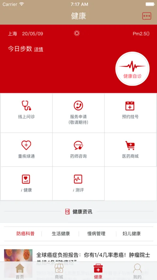 -健康管理:为您提供健康资讯、线上问诊、电话医生、预约挂号、每日步数等服务,让您时时关注自身健康。