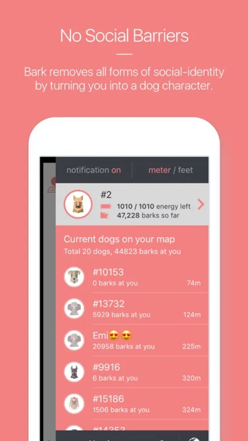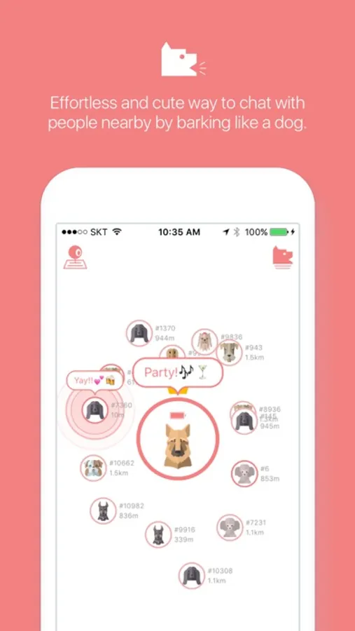 Bark transforms people nearby into fun barking dogs. Every user chooses one of the 8 different dog breeds and chats with other barkers by communicating like dogs.