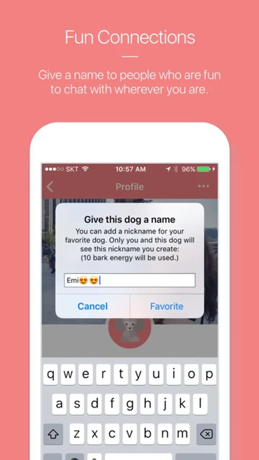 * Simply bark at each other within a 1 mile radius by pressing the bark button.