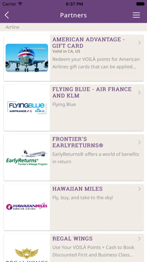 A selection of VOILÀ’s current redemption partners include airline programs such as Alaska Airlines Mileage Plan, TudoAzul by Azul Brazilian Airlines, TrueBlue by JetBlue, Virgin America Elevate Program, Flying Blue (Air France / KLM), Southwest Airlines Rapid Rewards, Virgin Atlantic flyingclub, EarlyReturns Hawaiian Miles, Iceland Air Saga Club, US Airways Dividend Miles, and Regal Wings; retail partners such as Amazon.com, Facebook, Overstock.com, Visa Incentive Cards, MAGSFORPOINTS, Multiplus Fidelidade, RewardsPay, Smiles, Mango, iTunes™, Emaar, iFly Dubai, Ski Dubai, and Thanks Again; and charitable causes such as Breast Cancer Research Foundation, Kula, Worldreader.org, and Kiva.