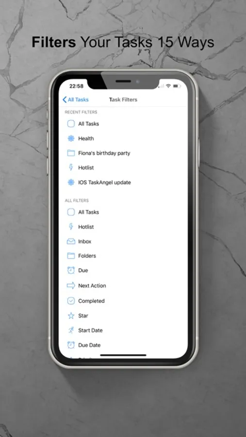 * Filters - make shortlists of tasks depending on when they are due, or what folders they are in, or whatever.