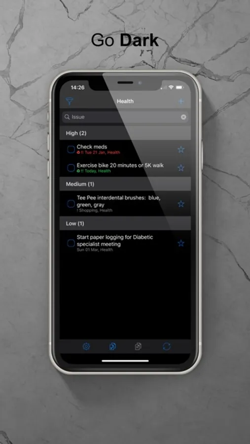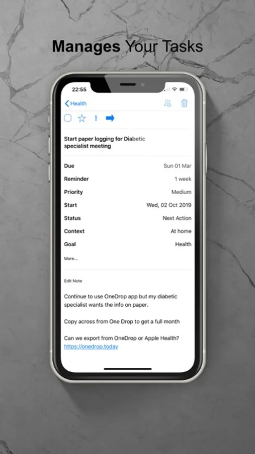 * Group your task list using a choice of six properties - priority, status, folder, context, goal, or tag