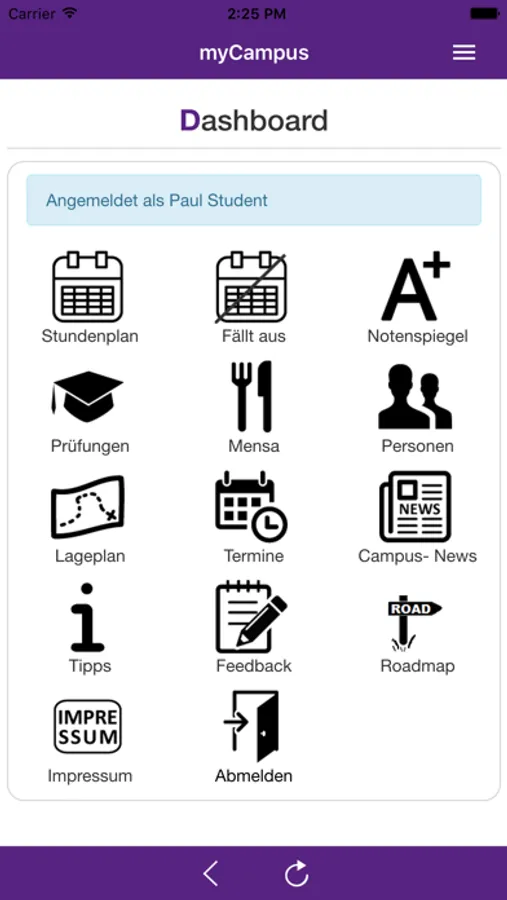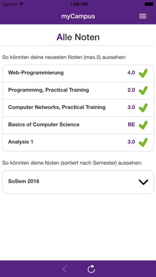 - Studieninteressierten zeigt die App Beispiele für Notenspiegel, Prüfungsanmeldungen, Stundenpläne usw.
