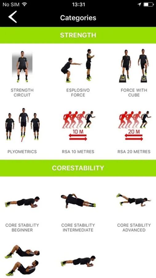 You can choose among 19 training programs divided into 4 categories: Strength, Running, Core Stability and Prevention. You can also use the Challenge Option that will give you different training sessions every day for a period of 2/3 weeks. The Challenge Option is studied for players who need to get back into good condition before the usual preparatory phase of a team or after a period of inactivity.
