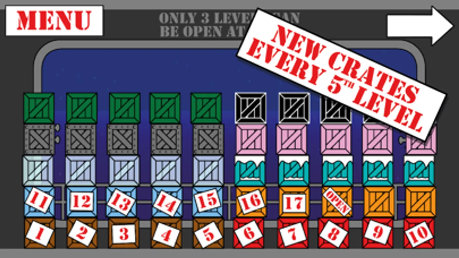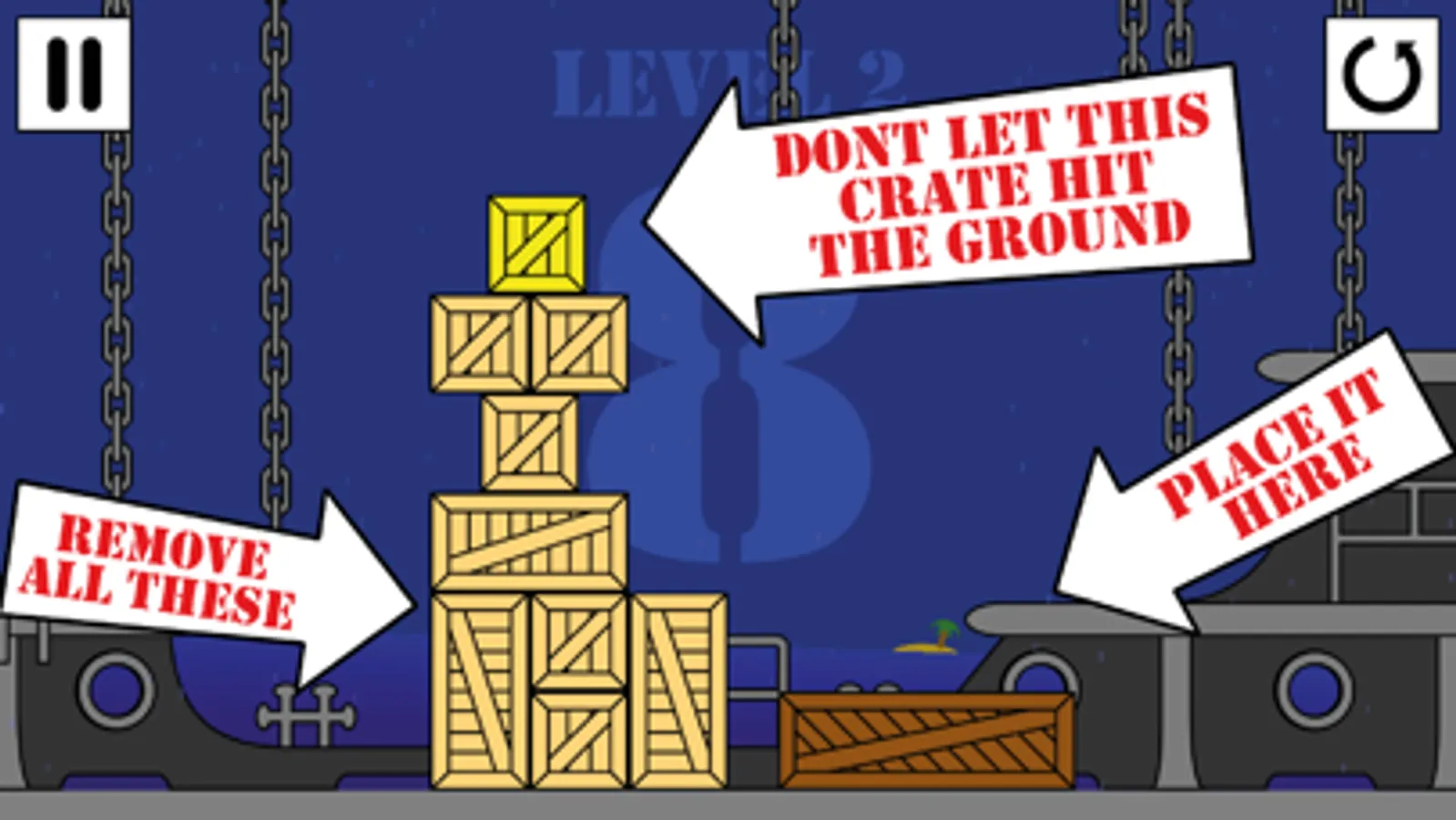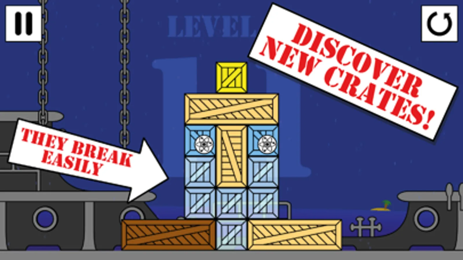 The goal of the game is to place the yellow crate safely on top of a brown crate. You have to remove all the other crates (by tapping them) in order to complete the level. The level will restart if the yellow crate hits the ground. Every 5th level you complete a new type of crate is revealed. New crates have different attributes and different behavior when you tap them.