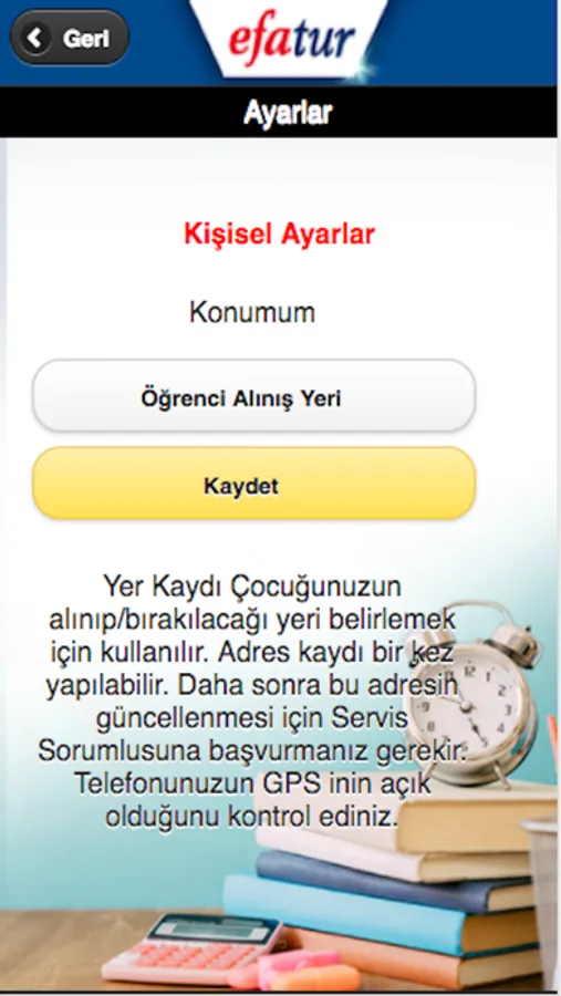 EFATUR SERVİS, EFA TUR servis hizmeti alan personelin, kendilerini almaya gelen servis aracını izlemeleri, alımlarına ne kadar süre kaldığını görmelerini, dilek ve şikayetlerini servis yönetimine bildirebilmelerini sağlayan mobil uygulamadır.