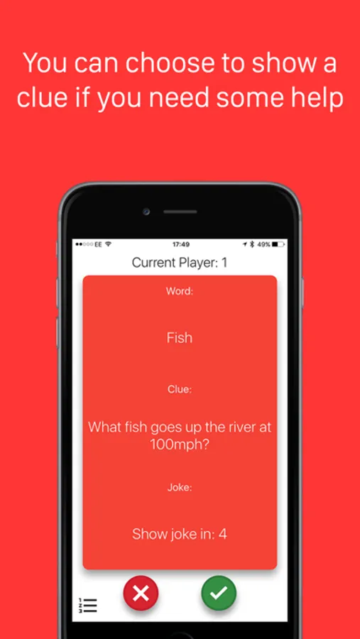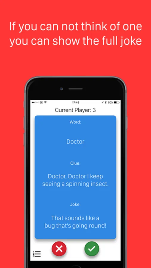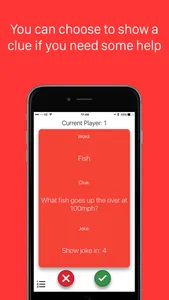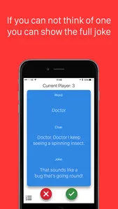 You will be awarded three points if you can think of a joke without the clue, one point if you can think of a joke with the clue but zero points if you choose to show the full joke. The app will track your scores until one of the players reaches the target score selected at the start of the game.