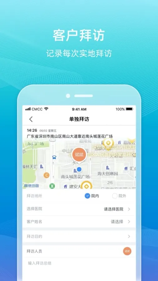 3、客户拜访:客户拜访简洁精准,定位,记录,可靠高效,上级可查;