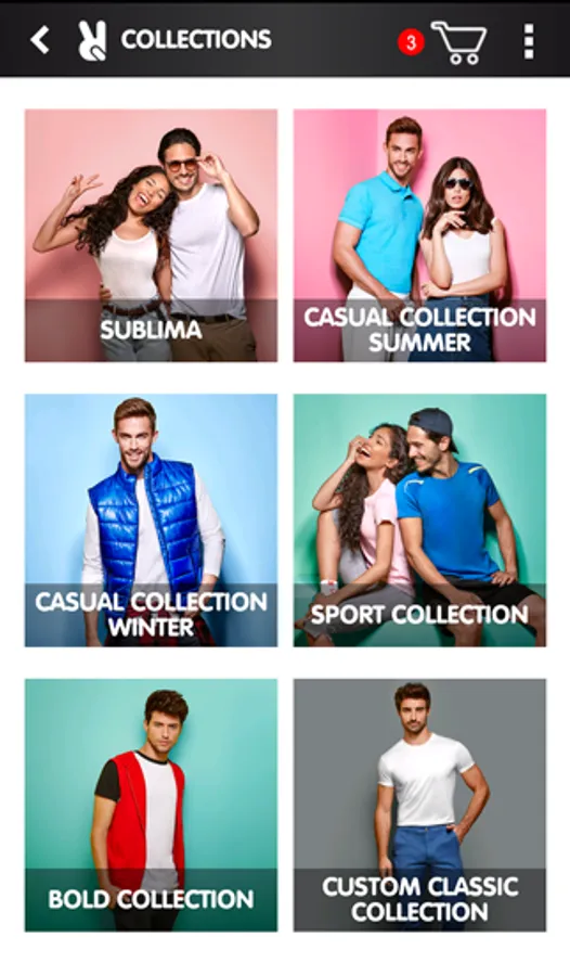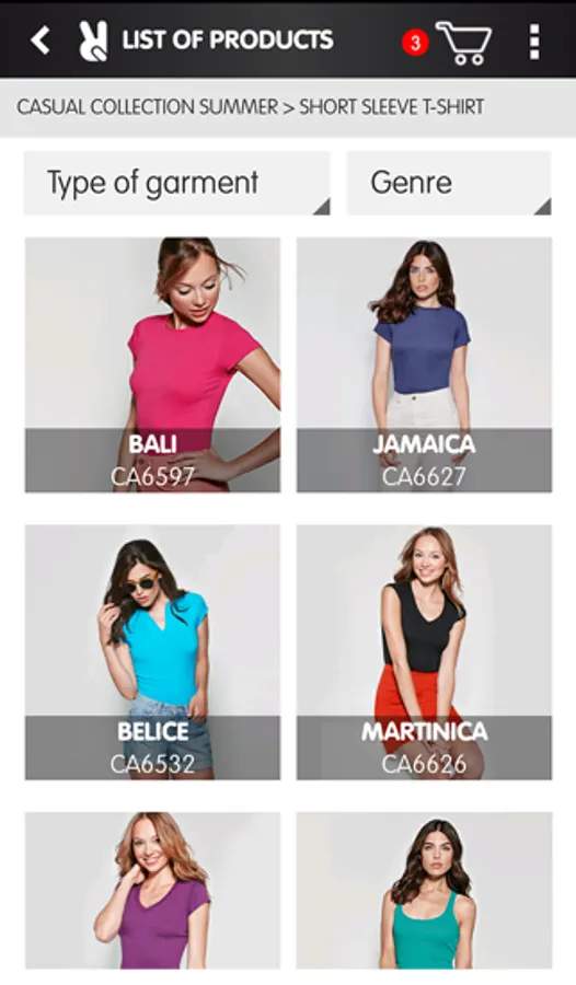 The application presents the collections of the brand by themes (Casual summer, winter, workwear, sports, school, accessories, etc.), and offers the possibility to consult their products according to the criteria required by your projects. For example, you can check all products of a given colour, or a particular type of garment or a particular composition.