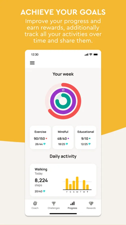 Health progress: Measure your progress in health-relevant activities, mental focus, and self-education. Use our coaching sessions or track your activity with a wearable or your phone. Stay on track, measure your progress, and get rewarded week by week.