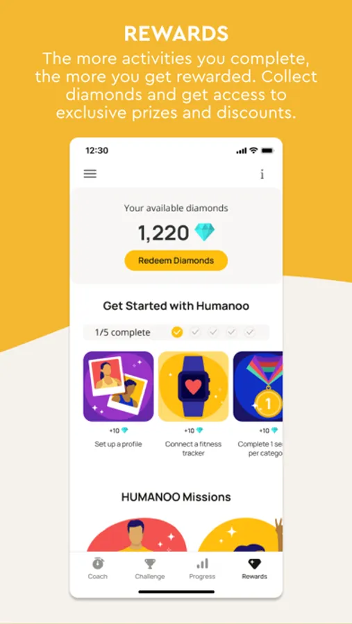 Rewards: With Humanoo, the more activities you complete, the more you get rewarded. Earn diamonds for every activity: Walk, run, exercise, bike, learn or meditate. And by completing our missions, you can gain even more diamonds! The new rewards program makes it easy to collect and redeem diamonds, granting you access to exclusive discounts for Humanoo users.