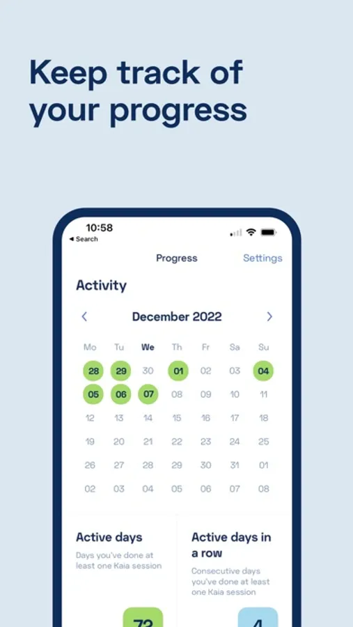 • PROGRESS & MOTIVATION: Kaia tracks your training and keeps you motivated towards your health goals.