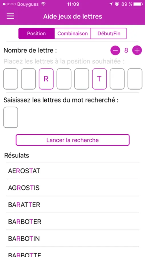 Une aide aux jeux de lettres pour rechercher un mot en fonction de la position précise de lettres ou en combinant toutes les lettres d’un mot. Une aide précieuse pour tous les cruciverbistes et passionnés de jeux de lettres.