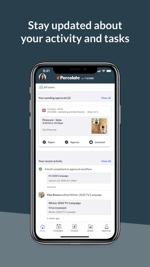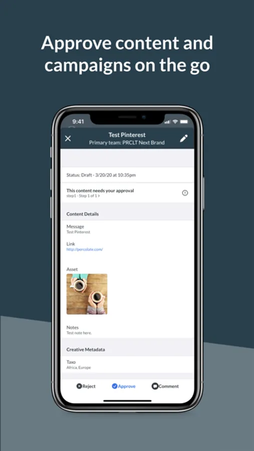 Percolate is the System of Record for Marketing. Percolate’s mobile app enables senior marketers to govern their brands on the go. Breeze through approvals on your own time to keep your team moving without roadblocks. See everything happening across your brand in a simple activity stream where you can trigger action as needed via comments and @mentions.