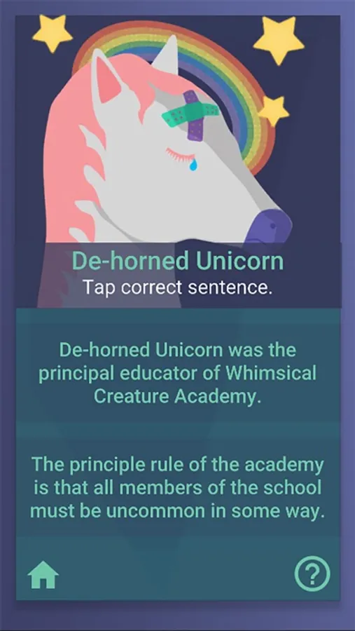 The helpful critters in this app want you to understand common grammar mistakes. Your mission, if you choose to accept it, is to select the correct sentence. Incorrect answers will lower your overall score. Follow onscreen buttons to move through the app, and as always, may the grammar odds be ever in your favor!
