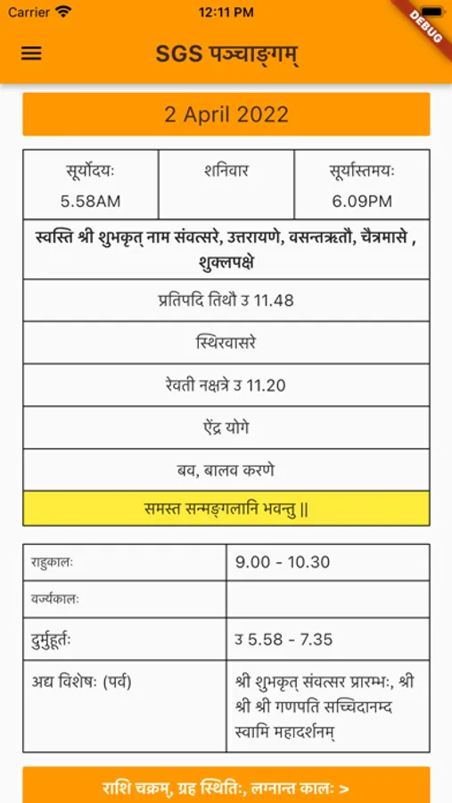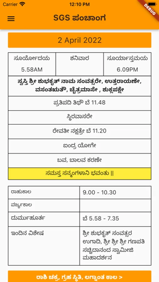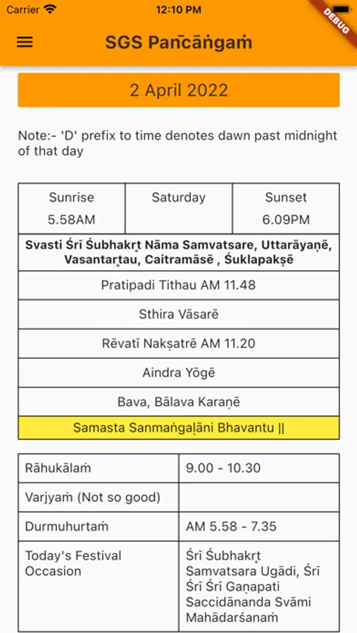 Panchangam is the almanac followed by Sanatana Dharma followers SGS Panchangam App shows the five aspects of each day based on planetary motions. Tithi, Vara, Nakshatra, Yoga and Karana. Panchangam is used and recited by many Sanatana Dharma followers in many rituals.