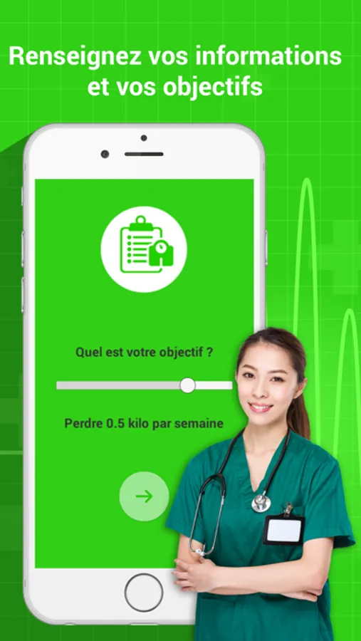 -Tous les jours, indiquez votre poids, regardez votre progression sur un graphique détaillé.