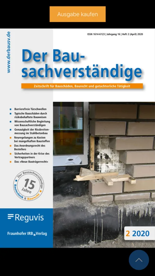 Der Bausachverständige erscheint sechsmal im Jahr. Für BauSV-Premium-Abonnenten ist die E-Journal-Ausgabe kostenfrei. Melden Sie sich einfach mit Ihrer Auftragsnummer an (Sie finden diese auf Ihrer Abo-Rechnung oder dem Versandetikett , oder Sie melden sich per E-Mail: redaktion@derbausv.de).