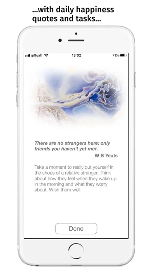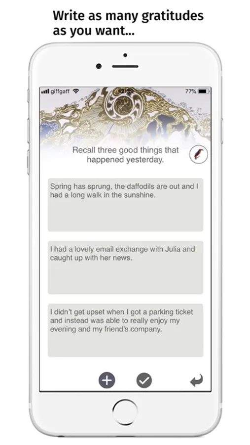 This app will help you be happier! It pushes you to think about what has gone right in your day, which has been shown to increase happiness. Every time you note down what good things have happened (and there is always something), you receive points you can use to build up a garden and also a Gratitude Card with suggestions for further things you could do to increase your gratitude and happiness.
