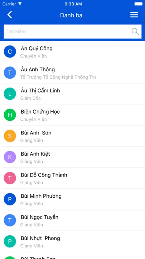 - Danh bạ: Với việc cài đặt APP Trường trên điện thoại bạn không cần phải dò tìm email hay số điện thoại liên lạc của bất kỳ nhân viên nào của Trường trong sổ danh bạ nữa, tất cả chỉ cần một thao tác tìm kiếm đơn giản, nhanh chóng ngay cả khi bạn không kết nối internet.
