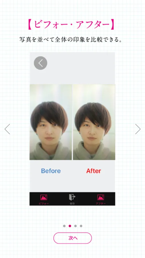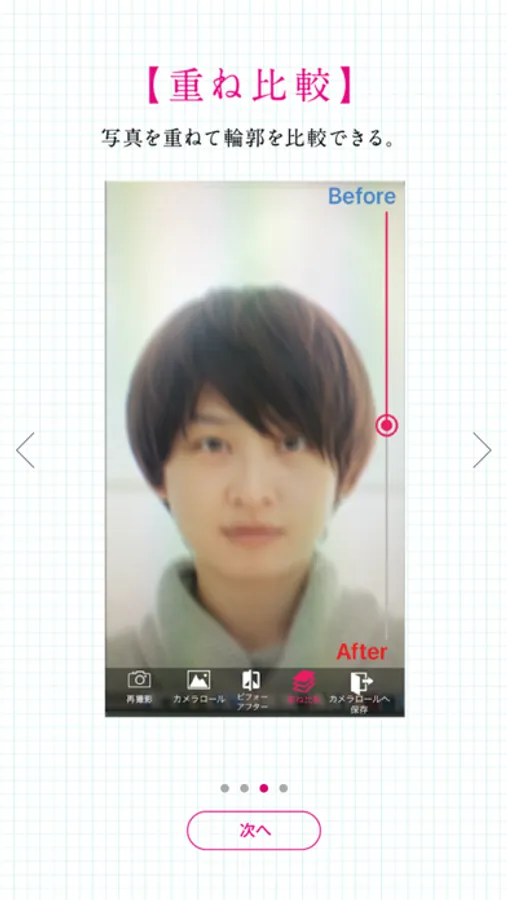 他の使い方としては、美容室に行く前にビフォワーの髪型とアフターの髪型を比べたり、メイクをする前とメイクをした後の顔の変化を比べることができます。
