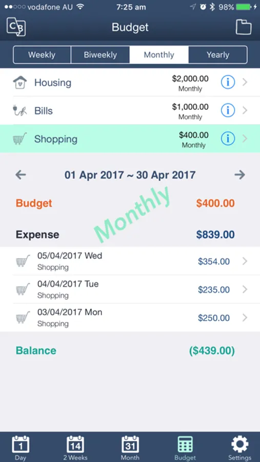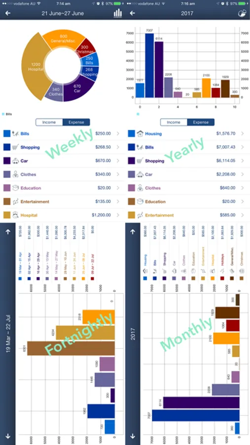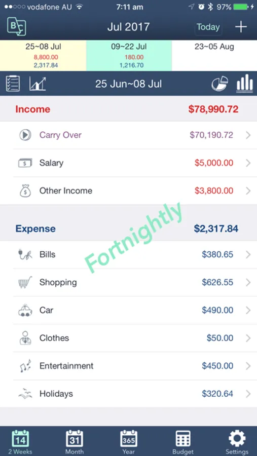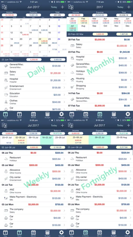 It provides various kinds of calendars such as Weekly, Fortnightly, Monthly, and Yearly. All income, expense, balance and budget will be listed based on the period designated by calendars.