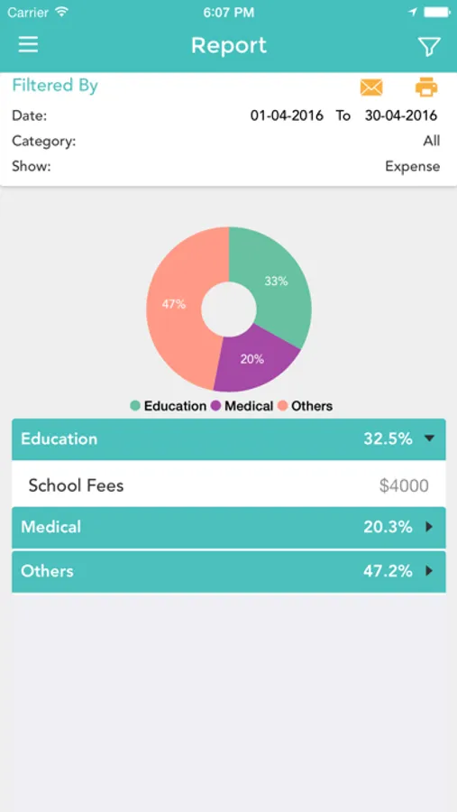 ⁃ Powerful reports by pie chart to show visually all parts of your finance