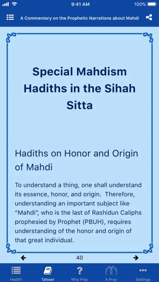 The Sihah Sitta includes two spectra of hadiths on Mahdism: In the first series of hadiths the notion of Mahdism is inferred from the hadiths, whereas the second group of hadiths includes special hadiths that only focus on the Mahdi. In this app and commentary, we first discuss hadiths from the Authentic Six with general references to Mahdism and then we discuss hadiths specifically dedicated to the Mahdi.