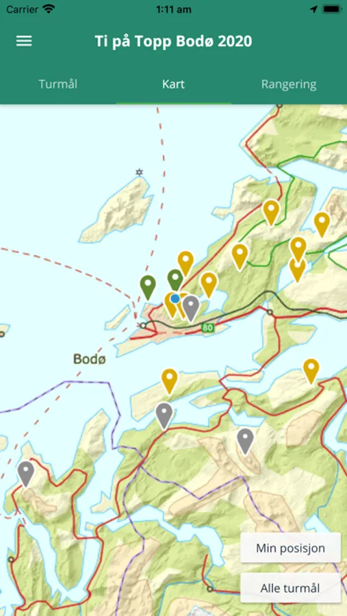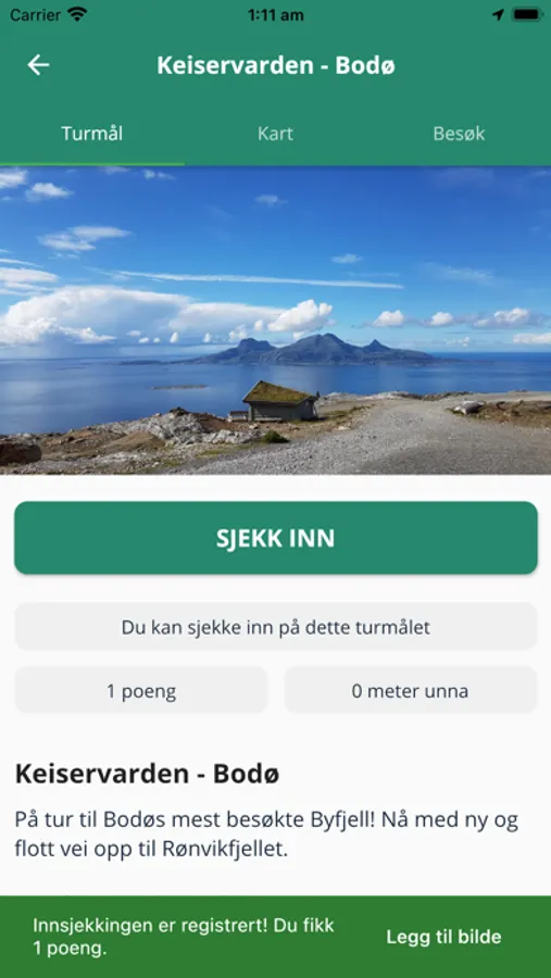 Når du befinner deg i nærheten av turmålet kan du registrere oppmøtet ved å klikke på en "Sjekk Inn" knapp i appen.