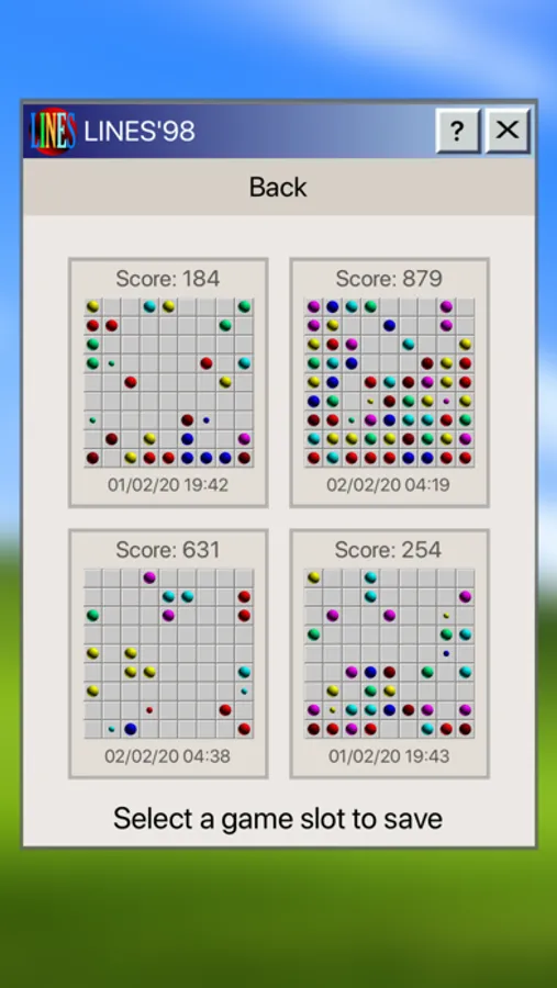 Lines 98 là một trò chơi đơn giản dựa trên bản Lines 98 cũ trên PC. Luật chơi đơn giản, xếp các loại bóng cùng màu trên một hàng (ngang, dọc, chéo) để ăn điểm. Điểm càng cao nếu bạn ăn combo được càng nhiều hàng. Game có chức năng tự động lưu lại quá trình chơi.